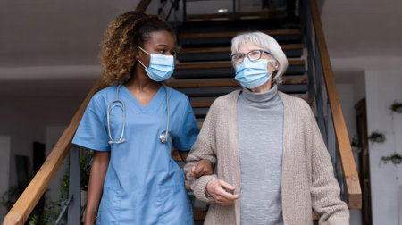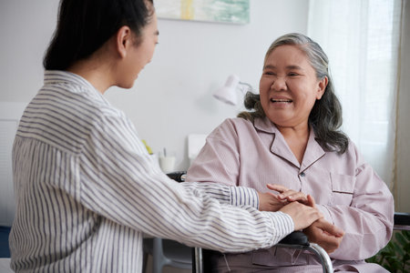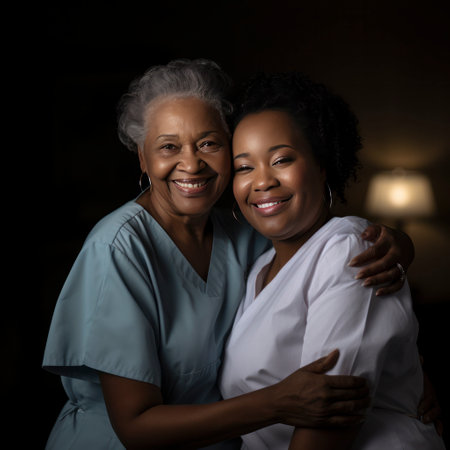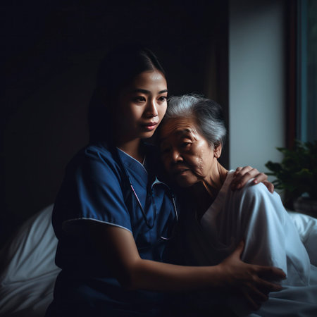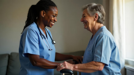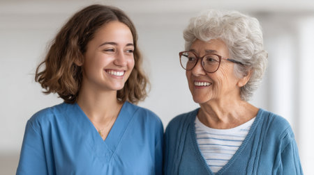Young nurse in uniform gently holds the wrinkled hands of a smiling senior woman, providing comfort and care in a cozy home setting. focus on connection, empathy, and support.