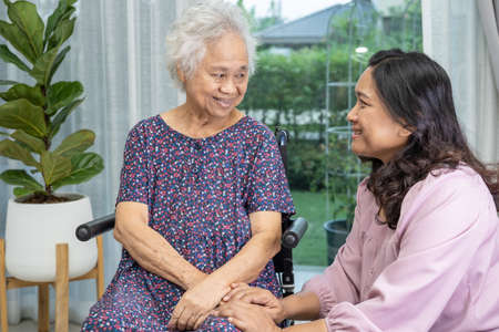 Help and care Asian senior or elderly old lady woman patient sitting on wheelchair at nursing hospital ward, healthy strong medical concept