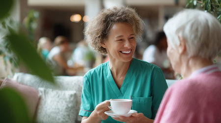 Nurse smiles while serving tea to elderly woman in a cozy care home setting