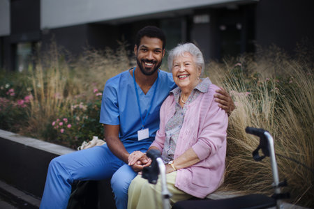 Happy senior woman sitting and talking with medical assistant in front of nurishing home.
