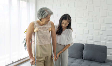 Young asian woman help her grandma walk by using axilla crutches. Senior gray hair woman exercise and practice walking at home.