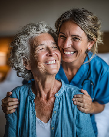 A young caregiver and an elderly woman express joy and connection indoors, highlighting the importance of companionship and care in healthcare settings.