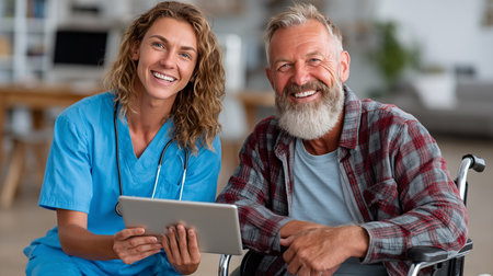 Portrait of smiling nurse and senior man using digital tablet at home