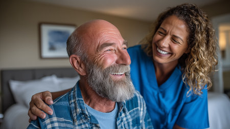 Joyful elderly man with gray beard is being assisted by caregiver in a cozy indoor setting, highlighting the bond of care and companionship in a nurturing atmosphere