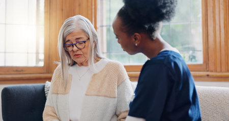 Senior, sad woman or nurse with support or results in consultation for bad news or cancer disease. Stress, depression or caregiver with a crying mature patient for empathy, sympathy or help in home