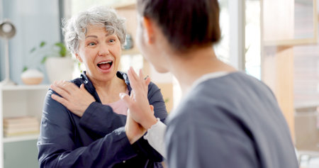 Physiotherapy, shoulder and senior woman consulting, high five and healing with healthcare, wellness and osteoporosis. Chiropractor, arm and old person with rehabilitation, recovery and diagnosis