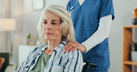 Senior woman, wheelchair and caregiver with comfort, support and console for depression in retirement. Nurse, patient or elderly person with disability, recovery and sad with rehabilitation in house