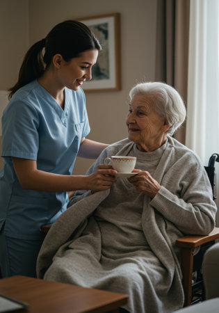 A compassionate healthcare worker pours a cup of warm tea for an elderly woman, demonstrating care and kindness