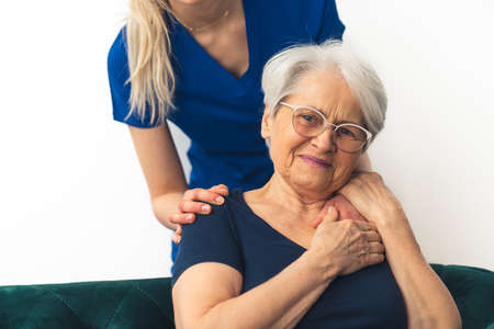 Senior support concept. Elderly gray-haired caucasian lady being supported by a nurse. High quality photo