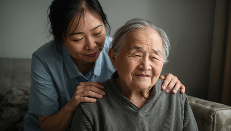 Senior woman and caregiver share a heartfelt moment indoors. The image reflects medical assistance, trust, and daily life in nursing or assisted living environments