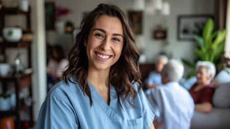 A nurse woman caregiver in a medical gown stands in a nursing home against the backdrop of a group of elderly people.