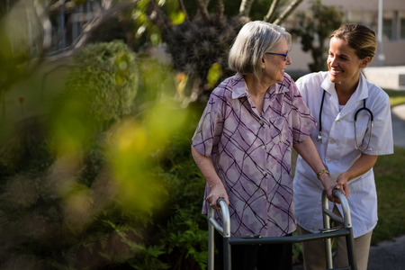 Asian young nurse take care a senior with a walker. A nurse with a patient try to walk in a retired home service.