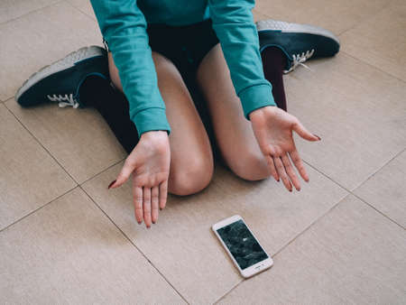 Girl with broken screen smartphone on the tile floor.
