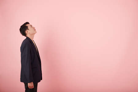 Hopeful young Vietnamese businessman looking up waiting for sign to move forward