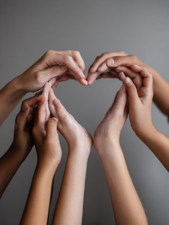 Multiple hands of different skin tones come together to create a heart shape, symbolizing love, community, and connection in a shared moment of joy.