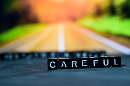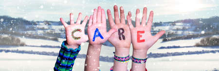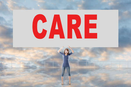 care, single word set with vintage letterpress printing blocks on rustic wooden background