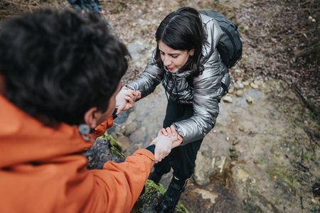 Hiker Helping Companion Traverse Rocky Terrain in Outdoor Adventure