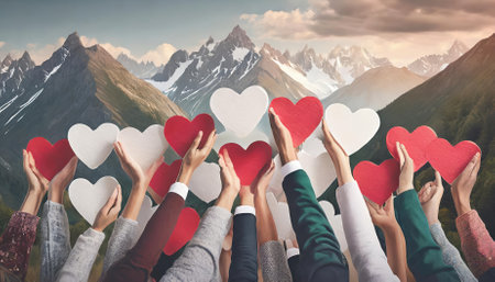 This vibrant image captures a diverse group of individuals with their arms raised, celebrating love and unity as they reach towards beautifully handpainted hearts. A powerful symbol of charity.