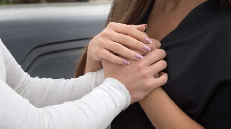 Close-up of the hands of a man and a woman. Male hands stroking the hands of a young woman stroking. Love and support concept