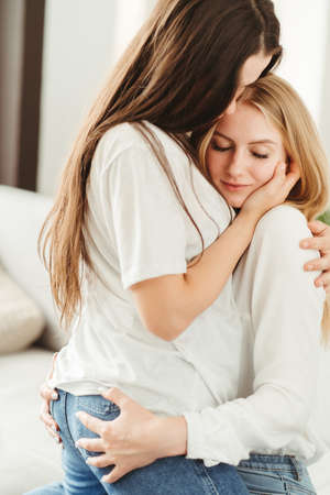 Two young Caucasian women embrace tenderly. Same-sex relationships.