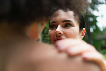 Lesbian woman touching blurred african american girlfriend outdoors