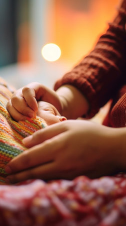 Mother uses her hand to hold her baby's hand to make him feeling her love, warm and secure.