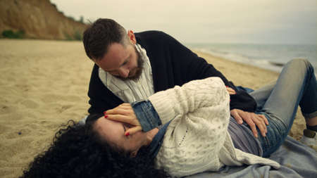 Happy couple enjoying romantic date at beach. Joyful people flirting by sea close up. Mixed race boyfriend girlfriend laughing together on ocean coast. Lovers on honey moon. Love affection concept.