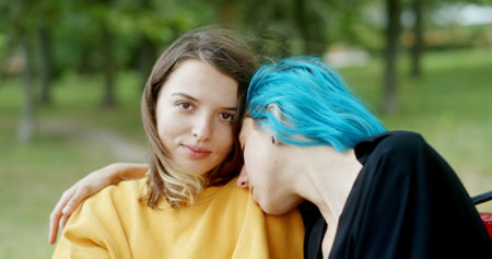 Close up of lesbian couple embracing Gently touching each other while sitting on bench in park. Samesex love.