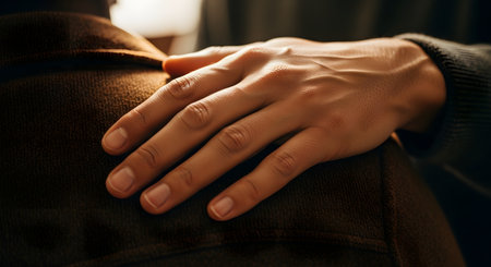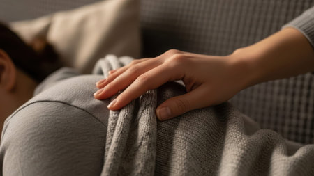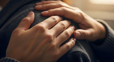 A close-up shot of two hands resting gently on a person's shoulder, which is covered by a gray knitted sweater. The image, with its warm, soft lighting, conveys comfort, support, empathy, reassurance, and human connection.