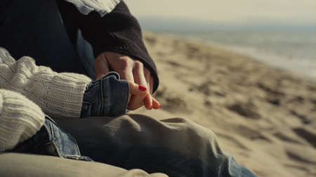 Lovers holding hands together on sand beach. Close up couple relaxing on sea coast shore. Unknown girlfriend boyfriend arms touching each other on romantic date outdoors. Peaceful calm love concept.