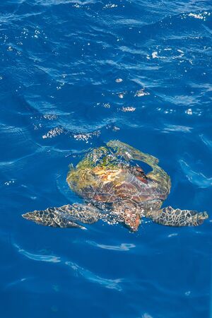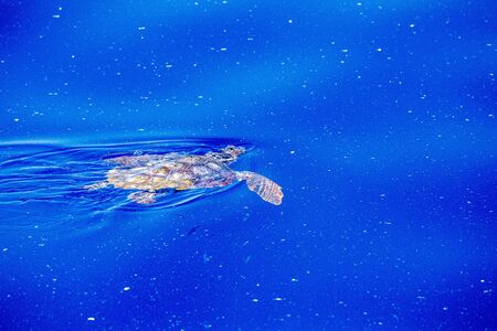 baby newborn caretta turtle near sea surface for breathing in mediterranean