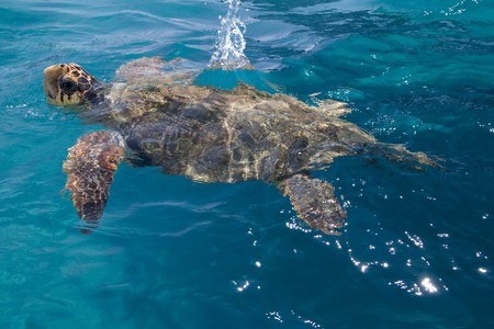 Caretta Caretta Turtle from Zakynthos, Greece, near Laganas beach, emerges to take a breath