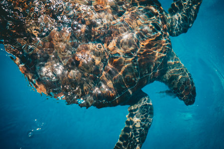 Green Sea Turtle swimming in a blue seawater. Bright sunlight with glitter sparkles. Similan Islands, Andaman Sea, Thailand. Summer season. Focus on surface of seawater.
