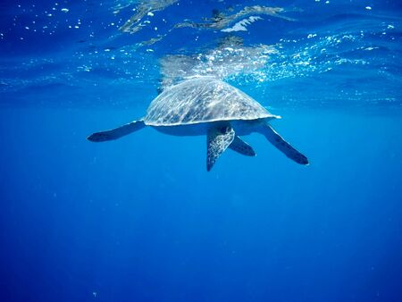 Sea turtle diving down. Tropical blue ocean water deep environment wildlife backfround