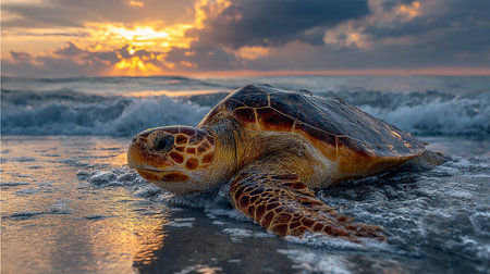 rescue a sea turtle thrown ashore in a storm, horizontal format
