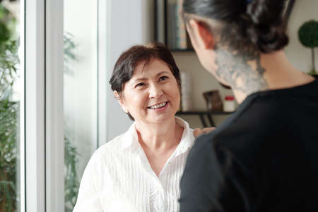 Happy smiling mature mixed-race woman looking at adult son visiting her at home