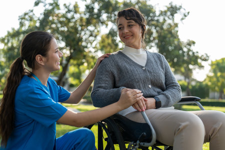 A CaregiverCaring nurse assisting woman in wheelchair outdoors, showcasing compassion and support