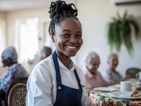 A warm and inviting scene inside a nursing home or elderly care facility, featuring a cheerful caregiver interacting with senior residents gathered around a table. The caregiver, dressed in a white uniform with a blue apron, is smiling warmly, leaning in to provide a comforting and attentive presence. The seniors are seated around a table covered with a floral-patterned tablecloth, enjoying a casual moment with plates, cups, and glasses neatly arranged. A small green potted plant adds a touch of freshness to the scene. The room is bright and welcoming, with natural light streaming through the window and simple, clean decor, including a white wall, an air conditioner, and subtle greenery hanging on the wall. The atmosphere exudes care, companionship, and a sense of community. Perfect for conveying themes of healthcare, elder support, or senior living environment --ar 4:3 --style raw --profile wi6l5b1 --v 6.1 Job ID: 4e1b57f1-acf2-40d3-b649-287233592d51