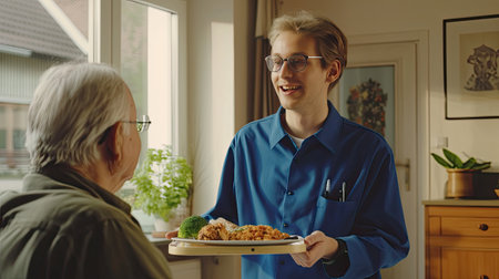 a young male nurse in a blue uniform serving dinner to an elderly man at home, radiating a warm smile, set indoors by the window of his living room, with a wooden tray of food