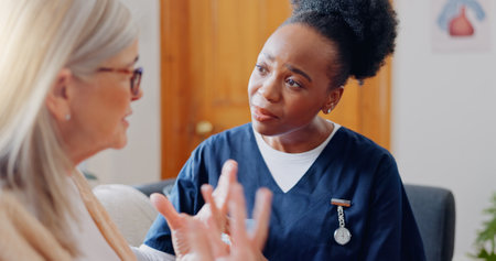Frustrated, sad woman speaking or nurse with results in consultation for bad news or cancer. Stress, lady talking or caregiver with a depressed mature patient for empathy, sympathy or help in home