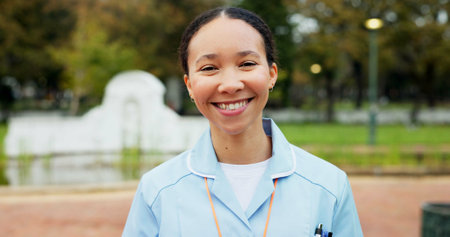 Professional nurse woman, park and face with smile, young and excited for healthcare career in Toronto. Medic girl, outdoor and nature for walk, wellness and happy in summer sunshine in portrait