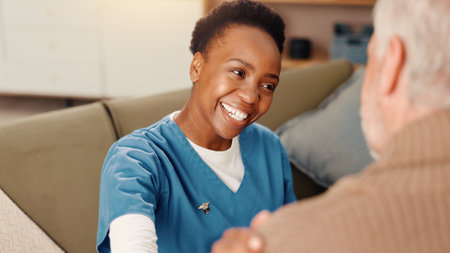 Black man, caregiver or old woman in wheelchair talking or speaking in homecare rehabilitation together. Medical healthcare advice or male nurse nursing or helping elderly patient with disability