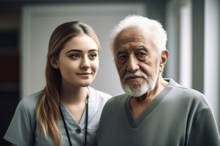 Generative AI : friendly nurse and an old patient in a clinic