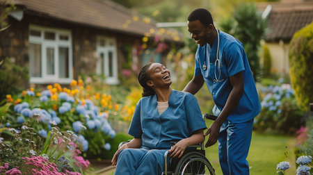 African American nurse and patient in wheelchair smiling at each other in garden.