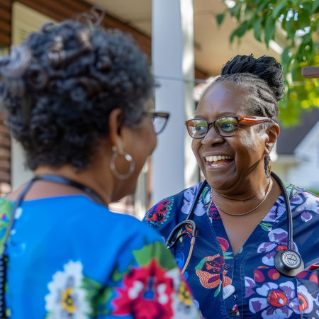 A cheerful female caregiver in patterned scrubs laughs while comforting a happy woman in a colorful african dress during a meeting in a diverse community center waiting room.