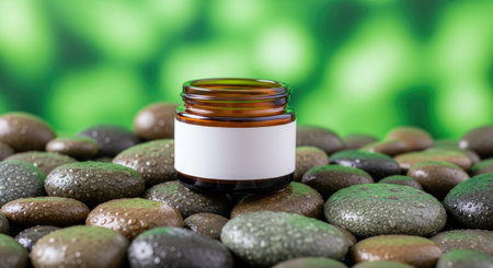 Plain amber jar with white lid placed among smooth stones and leaves for a natural wellness look