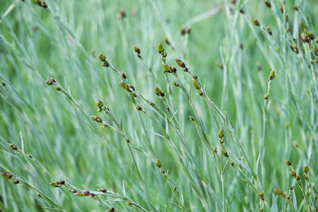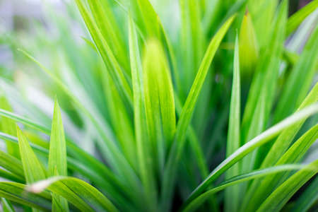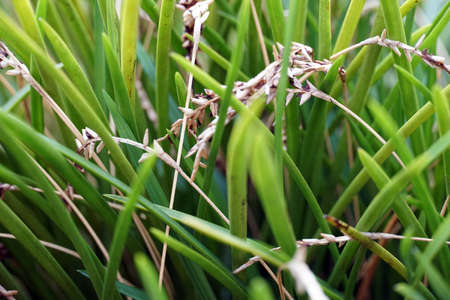 Close up shot of green grass thin leaves. Field vegetation and botanicals plants