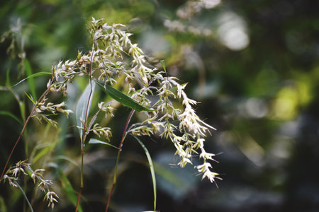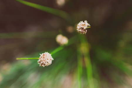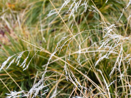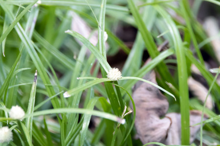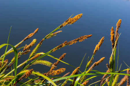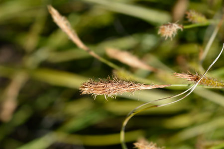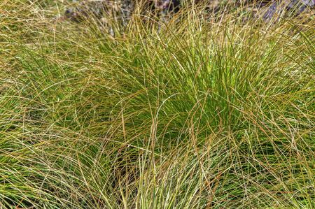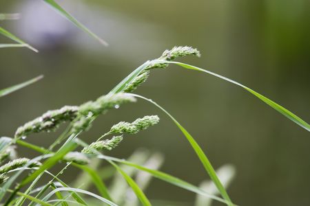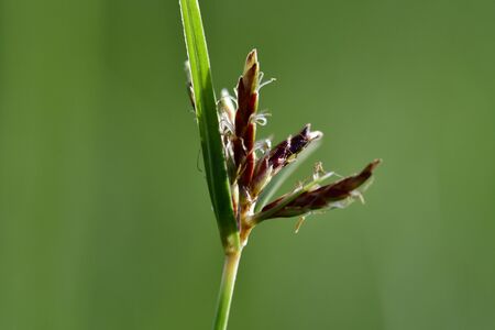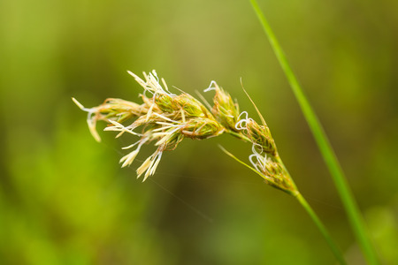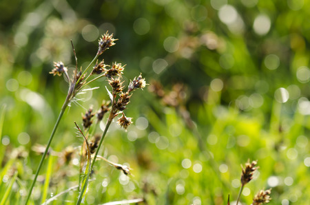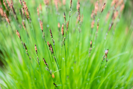A beautiful sedges growing in a marsh after the rain in summer. Shallow depth of field closeup macro photo.