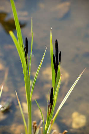 White spheric flowers of American bur-weed (sparganium) are blooming on the stem in the swamp waters in summer.