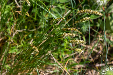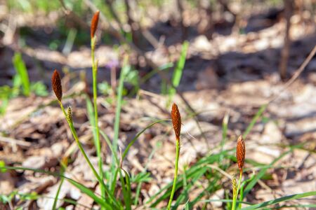 Sedge hairy blossoming in the nature in the spring.Carex pilosa. Cyperaceae Family.